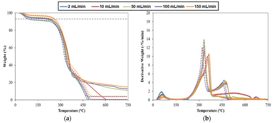 The TGA experiments, as mentioned before, were performed with different atmospheres to study their influence on the thermal decomposition as a function of the flow rate. This is one of the most significant factors in the thermal decomposition of pine wood particles since in industrial furnaces, ambient oxygen concentration varies through time, which means that the reaction will change from pyrolysis to combustion. In this way, to analyze and compare both thermochemical conversion processes, Figure 1a,b present the TG and DTG curve, respectively. From Figure 1a, it is possible to observe that in the last combustion stage, when the temperature is higher than approximately 350 °C, different TG and DTG curves as a function of different atmospheres were obtained. According to these figures, thermal decomposition under oxidative atmosphere (TG and DTG curves with dashed lines) occurs in three different stages: drying of the sample, devolatilization and finally the oxidation of the remaining char. However, when the inert atmosphere was applied (solid lines), only the first two stages took place. After the drying step, the second stage occurs between around 200 °C and ends at approximately 400 °C depending on the flow rate. Above the last temperature, mass loss continues at a slower rate, and this process is associated with the slow degradation of lignin [37]. Furthermore, as can be observed in Figure 1b, the oxygen that is present in the oxidative atmosphere affects the maximum value of DTG curves, increasing its value, which is 15% higher than in an inert atmosphere, and decreasing the time needed to complete the reaction. Additionally, the maximum values of DTG curves were shifted to a lower temperature when compared to the maximum values obtained with the inert atmosphere.
