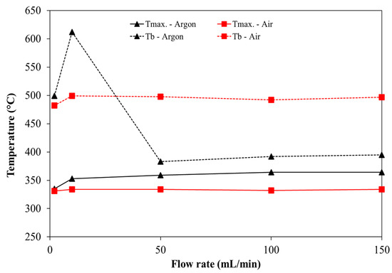This can also be observed through the analysis of the temperature where the maximum reaction rate occurs (Tmax). Figure 2 presents the variation of Tmax and Tb, and it is possible to observe that experiments with oxidative atmosphere lose mass faster at lower temperatures when compared with experiments with inert atmospheres. This is a consequence of the presence of the oxygen that enhances the degradation of the pine due to the appearance of gas-phase reactions between the volatiles released and oxygen. Consequently, the oxygen promotes the oxidation of the remaining material, char, from the previous reaction and promotes its combustion extending the mass loss when compared with experiments with an inert atmosphere. This is the reason why in Figure 2, Tb is higher in experiments with air. Despite this, it is also important to point out that in the experiment with 2 and 10 mL/min of argon, similar behavior to the TG curves with the oxidative atmosphere was witnessed. This means that in experiments with low flow rates, independently of the atmosphere, the reaction is only temperature dependent and that similar mass loss behavior is obtained. However, as the inert gas flux is increased, the reaction was reduced, and lower Tb was obtained. In the experiments with air, only minimum effects were observed on the thermograms at higher flow rates.