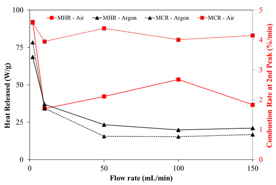 In order to outline the differences between pyrolysis and combustion of pine, Figure 3 presents the maximum heat released (MHR) during the experiments and the maximum combustion rate (MCR) at the second stage under different gas flow rates. As evident from DTG curves, the average rate of char combustion is approximately 5 times higher with oxidative atmospheres when the flow rate was higher than 10 mL/min. Regarding the maximum heat released, significant differences were observed as the gas flow rate was increased.