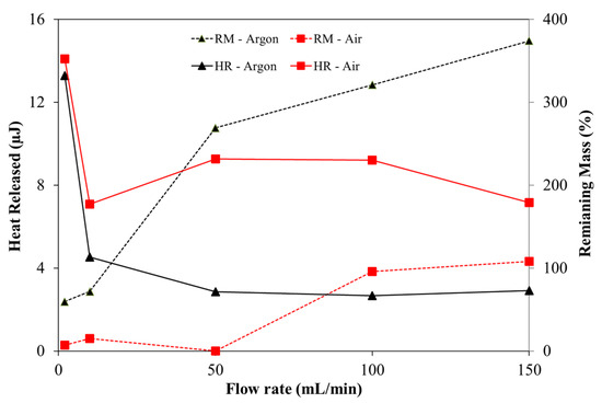 As the oxygen reaches the surface of the particles after the volatiles released, a heterogenous reaction takes place and more energy and mass loss occurs. In the experiments with the inert atmosphere, this phenomenon does not occur, and therefore, the remaining mass (RM) and heat released (HR) are higher than in experiments with the oxidative atmosphere. This fact can be observed in Figure 4. Furthermore, an interesting point is that increasing the gas flow rate means that the differences between inert and oxidative atmospheres are more evident. The heat released in oxidative experiments reaches levels 3.44 times higher than in an inert atmosphere.