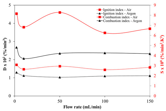 S also follows a similar trend to the D index. However, S values obtained from experiments with the oxidative atmosphere present even higher values than those obtained from an inert atmosphere. On average, its value is 1.7 times higher, which reinforces the more vigorous way that the samples are burned and how char is burned out faster in the experiments with air. An important aspect that should be pointed out is that with 50 mL/min air flow rate, the index S presents the highest value, which means that the most efficient general combustion performance is obtained to this flow rate. Therefore, the global oxidation reaction took place close to the stoichiometric conditions, and with the other values the combustion occurred in an excess of comburent and with a lack of stoichiometric comburent.