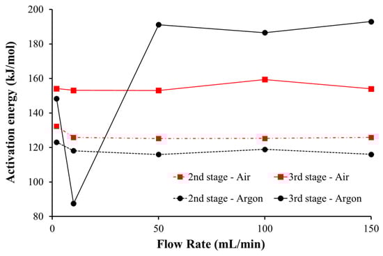 The dependence of the activation energy on the atmosphere was significant, mainly in the third stage, and it is illustrated in Figure 6. It can be observed that the activation energy in the second stage from the inert atmosphere is lower than the values from oxidative experiments. Although the differences are not substantially different, this means that the reaction of the volatiles released, and combustion is less reactive than the pyrolysis.