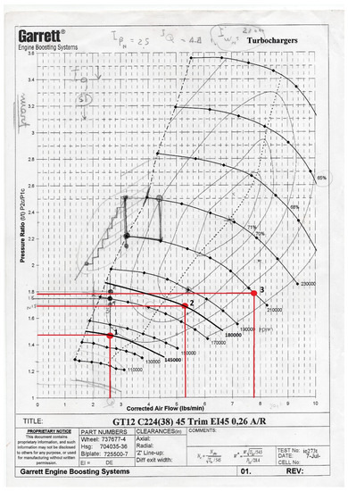 In gasoline-fueled ICE, most turbocharger units today are back-to-back, radial/radial compressor/turbine assemblies (Figure 1): the exhaust gases from the engine power the turbine that in turn powers the compressor (other solutions adopted in commercial vehicles include the use of volumetric compressors, but they are not investigated here). A schematic representation of the process and of the subsumed ideal and real (indicated) cycle is shown in Figure 2 [5].