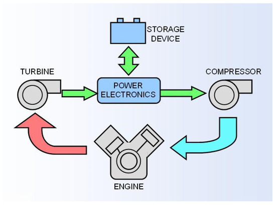 At the system level, the existing configuration can be improved by adopting what is known as the “hybrid turbo compound” (Figure 6): the mechanical link between compressor and turbine is eliminated and each machine operates along its “optimal” curve. The compressor is powered by an electrical motor fed by the battery pack of the hybrid vehicle, and the turbine is coupled to an electrical generator that feeds the same battery pack. In this way, the excess power can be directly recovered by storing it in the form of electrical energy: this solution is particularly advantageous in a hybrid propulsion system in which additional kinetic-to-electrical energy recovery is enforced via a KERS. A properly designed electrical control unit, together with a specific engine tuning, results in the elimination of the waste gate valve, increasing the propulsion efficiency under road conditions. As a direct consequence of the mechanical separation of the two rotors, substantial savings in fuel economy are likely to emerge (less energy extracted from the battery per unit of energy delivered to the wheels).