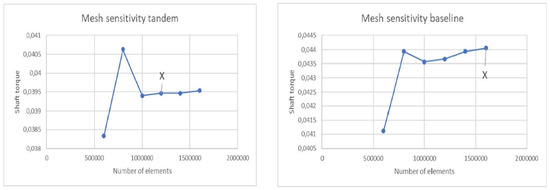 A mesh sensitivity analysis was run on each configuration, the objective function being the shaft torque. Quite obviously, the results are geometry-dependent (Figure 8): the final meshes contained 1.6 × 106 and 1.2 × 106 nodes for the standard and tandem rotor, respectively. The diffuser mesh contained 1.6 × 105 (Garrett) and 1.2 × 105 (Tandem) nodes. The final rotor meshes are shown in Figure 9.