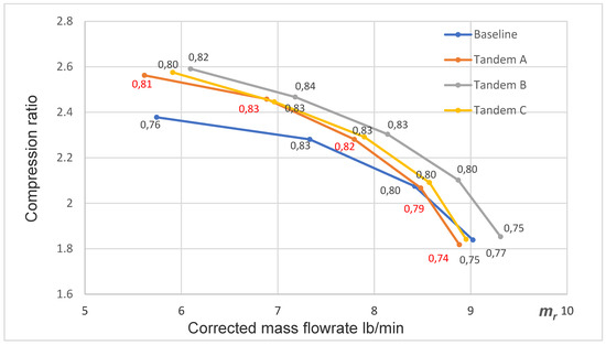 The most interesting global result is the compressor characteristic. Figure 10 shows that the tandem A configuration: