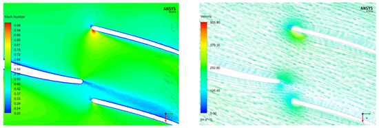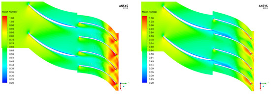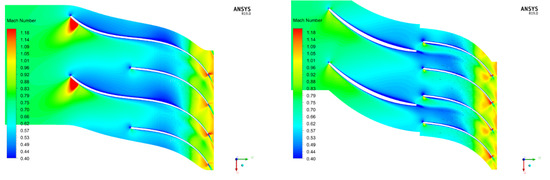 Relative Ma contours for the conventional (left) and tandem (right) compressor.
