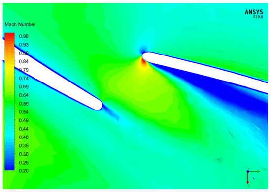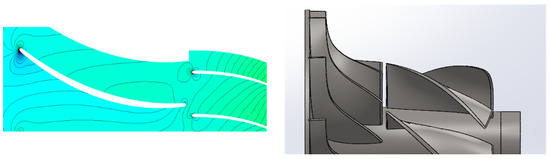 It also became clear that the two parameters that may influence the creation of a jet flow at the inducer/exducer interface are the axial clearance between the two (the larger this clearance, the more fluid “leaks” from the pressure to the suction side) and the “clock”, i.e., the circumferential angle between the two blades, which is the main factor controlling the interblade jet flow (Figure 16).