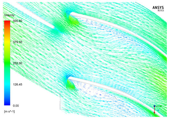 A second characteristic of the Tandem A rotor is the mismatch between the velocity at the inducer exit and the tangent to the chord of the exducer leading edge: this results in a relatively high incidence that—at low flowrates—promotes a detachment of the BL on the pressure side of the exducer (Figure 12 and Figure 13).