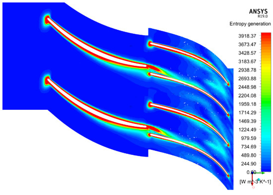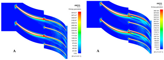It is instructive to examine the entropy generation rate through the blade passages, to gain some more insight into the phenomenological reasons of the performance improvement with respect to the conventional configuration. According to the Gouy–Stodola theorem, the useful work loss due to the presence of irreversible phenomena is directly proportional to the entropy generation: