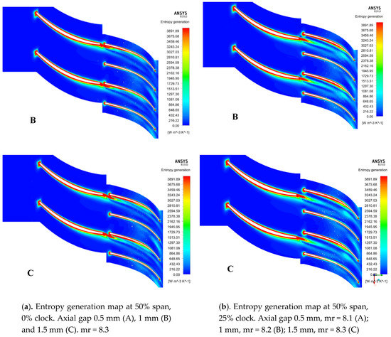 where λ and μ are the fluid thermal conductivity and dynamic viscosity, respectively, and Φ is the viscous dissipation function, modelled in the turbulent k-ε approximation adopted here and proportional to the turbulent dissipation rate. Figure 17 shows the entropy generation maps at 50% span for the Tandem B configuration for 0° and 25° clock and three different values of the axial clearance.