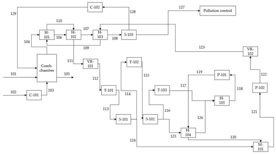 7]) were controlled by manipulating air inlet flowrate and flue gas recirculation. The equipment is indicated as follows: C-Compressor, P-Pump, S-Splitter, M-Mixer, H-Heat Exchanger, T-Turbine and VR-Regulator valve.