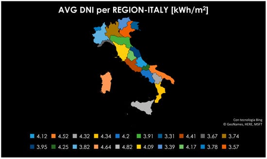 As illustrated in Figure 3, in Italy as in most countries, the DNI distribution is not homogeneous, displaying a minimum value of 3.31 kWh/m2 in Friuli-Venezia Giulia and a peak of 4.82 kWh/m2 in Sicily. For the sake of simplicity, a “representative” DNI value was obtained as a weighted mean of the regional values, using the surface extension of each region as weight. The result is an average DNI for Italy of 4.01 kWh/m2.