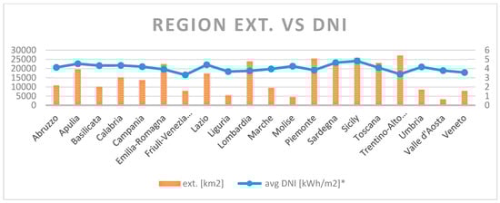 Solar irradiation is obviously an input into AG. However, a portion of it feeds thermal and photovoltaic commercial and residential installations. Figure 2 shows the average value of Direct Normal Irradiance (DNI) and the surface extension of each region of Italy (data collected from [32,33]).