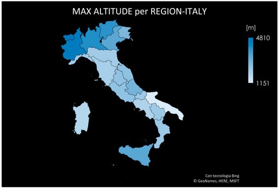 - From an orographic analysis of the Italian territory (Figure 4) [34] the sources’ altitude of the most important Italian rivers (Tevere, Serchio, Po, Arno, Adige, etc.) were derived.