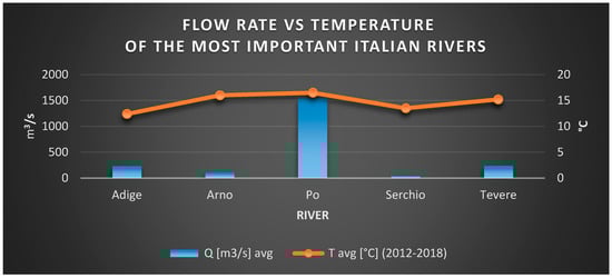 Figure 5. Flow rate of some of the major Italian rivers vs. their mean temperature between 2012 and 2018.