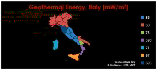 For the computation of geothermal exergy, the procedure was similar to those described above, with the data collected from [41]: the distribution of geothermal power is shown in Figure 8.