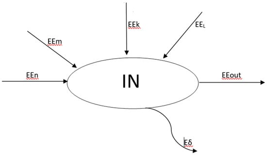 The rationale behind the computation is the following, considering the connections between the sectors as pointed out in Section 2.1. For the sake of clarity, let us examine in detail (albeit always at a schematic level, to avoid considering too many fluxes) the Industrial Sector IN (Figure 9). The sector is modeled as a black box: any exergy influx represents a physical flow of either energy or matter and has a label expressing the units of specific Extended Exergy ee (J) and its intensity m or P (kg/s or kW), so that its total contribution to the IN exergy budget is calculated as EEn = een*P or EEm = eem*m. The same is true for immaterial inflows, like capital flows (EEK = eeK*K) and labor (EEL = eeL*work hours). Since all outputs are also known, the exergy destruction is given (Equation (6) above) by the difference between the total input and the total output. The same applies to the remaining sectors: obviously, since the α and β coefficients depend on Ein and Econsumed, Do, and the labor and capital flows depend on the econometric coefficients, some iteration is necessary to reach convergence.