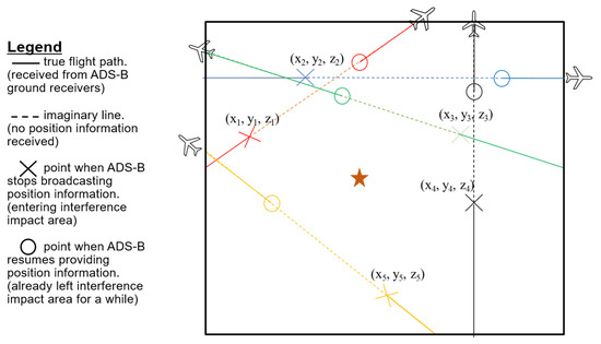 Figure 3 shows a top view of a hypothetical airspace under impact of interference event. This diagram represents what we may commonly observe during interference events. Imagine there is an interference source located at the orange star, if it is powerful enough, all aircraft entering and leaving the affected area of that RFI source would have gaps in their full flight paths. The cross marker shows the starting point of the gap in each ADS-B flight trajectory. The circle marker shows the ending point of each gap. Based on our assumption, we could say that the starting point of the gap is the exact point when aircraft starts entering the GNSS affected regions. However, the ending point of the gap is less predictable and likely be further away from the boundary. This is because after leaving the affected area, the receiver may need time to perform acquisition and signal validation before they can start recalculating and broadcasting their current position information.