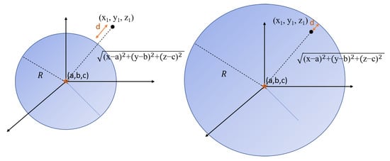 Then, instead of minimizing the absolute value of , we use the objective function shown in Equation (3). is a weight parameter which controls how much the cost function penalizes over-sizing the radius. This max function always returns the maximum value between fn and . This means if is positive, the cost function will penalize both “d(i)” and “R” depending on which one is larger. happens only when the starting point of the gap is outside the boundary of the sphere, as shown on the left hand side of Figure 4. Therefore, during the beginning of that phase, this objective function will try to speed up the process of expanding the bubble, since and it wants to minimize d(i). Later, it will try to slow down the expansion process, when R becomes larger than . happens when the starting point of the gap is within the boundary of the sphere, shown on the right-hand side of Figure 4. During that phase, since is negative, the cost function will only penalize . That helps prevent the boundary of sphere from expanding too far away from input data points.