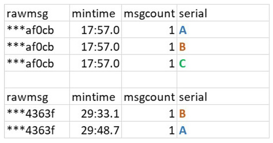 The first type of non-standard ADS-B ground receiver data is the type with inconsistent time. Figure 5 shows two sets of data recorded by Receivers A–C. We used letters to replace the true serial numbers of those receivers. From left to right, Column 1 is showing the content of the raw message and part of the message information is omitted. Column 2 displays the time when the respective message was received for the first time, Column 3 indicates the number of messages that have been received at that time, and Column 4 shows the name of that receiver. Receiver A has non-standard receiver behavior. Notice that, in this sample data, the first raw message was received by all three receivers at the same time. However, the second raw message was received by Receivers A and B at different times. Figure 6 shows how that the non-standard receiver timing causes problems. It is a time versus altitude plot for same flight with respect to different ADS-B ground receivers. Blue dots represents position information received by Receiver A. Because of the inconsistent internal clock of Receiver A, the blue dotted line is slightly off-track compared with the other receivers.