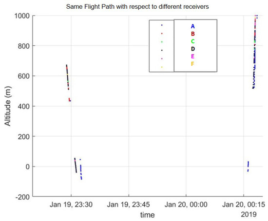 Time versus altitude plot of same flight with respect to different receivers.