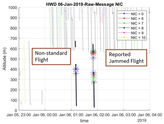 Figure 9 is an altitude versus time plot for all flights entering and leaving target airspace on 6 January 2019. All flight paths were plotted with dots and each dot represent one ADS-B airborne position message receiver by ground receivers. The color of each dot represents corresponding NIC value.