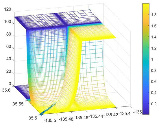 Figure 11 shows the heat map of the cost function (Equation (1)). The vertical axis represents value of cost function, while x and y axes are latitude and longitude. The color of the grid indicates the size of R. This heat map shows how the cost function varies with different values of x, y, and R. By converting cost function from Equation (1) to Equations (2) and (3), the results of the cost function are then constrained to always stay at the concave curve section of the heat map. This proves the convexity of our designed model since we are minimizing the cost function.