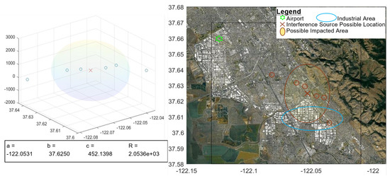 We initially tested our model with simulated data. We inputed seven points which are placed on a sphere with radius of 2. Figure 10 shows the result we obtained from our model. The red cross is the maximum likelihood location of the interference source. The sphere represents the possible size of the affected area. The calculated location of the interference source matches exactly with what it supposed to be. The calculated radius value is 1.9781, which is close to 2.