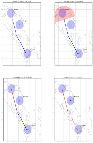 An example of how the state-vector data for an OpenSky flight was extrapolated and interpolated ready for science processing. (Top left) A plot of the coordinates (in blue) of a flight from Auckland to Kerikeri. (Top right) A schematic of start and end airport derivation for the flight. Blue circles denote a 2 km radius around an airport and the red semicircle denotes the field of view (extending to infinity), based upon craft heading, in which destination airports must fall. (Bottom left) The full flight data extrapolated between airports and interpolated down to a 1 s cadence. (Bottom right) Only extrapolated and interpolated data for the flight, shown in red.
