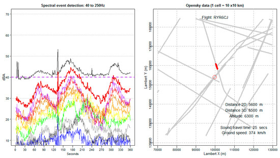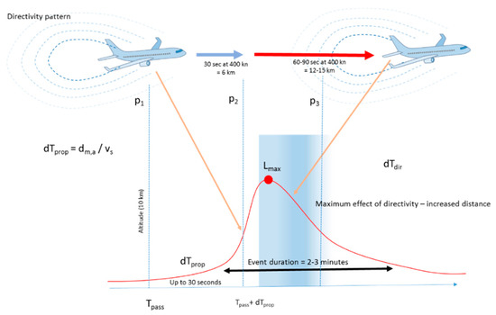 The first component includes the actual event detection of aircrafts—a pass-by at a low exposure level—followed by matching the detected event to the flight responsible for the event. This exercise is less straightforward than is expected at first glance. Two physical phenomena introduce time delays between the flight passage and the detection of the maximum levels of the aircraft event: the limited speed of sound and the directivity pattern of the sound emission of the aircraft. The impact on event detection is illustrated in Figure 1. A cruising aircraft flies at a typical height of 10 km, which results in a time delay of 30 s at the typical speed of sound (340 m/s). The aircraft emission expresses a strong directivity pattern, emitting the highest sound levels at the tail [12,13,14]. The directivity pattern is sensitive to the type of aircraft and especially the engine type and engine configuration. A typical jet engine expresses the strongest emissions towards the exit of the jet engine. Strong directivity will result in even larger time delays. The maximum exposure at ground level is the combined result of the distance, altitude and directivity of the aircraft. Wind speed and wind direction will modify the maximum levels but will not impact noise event delay. In the extreme case of high-altitude cruising, an aircraft can travel up to 20 km before the peak exposure occurs.