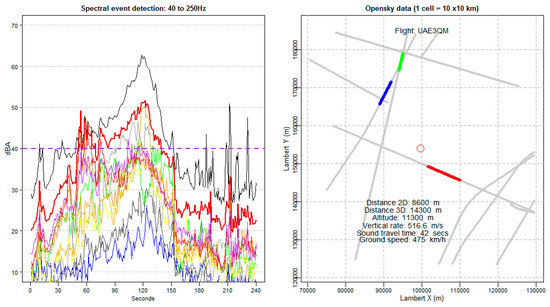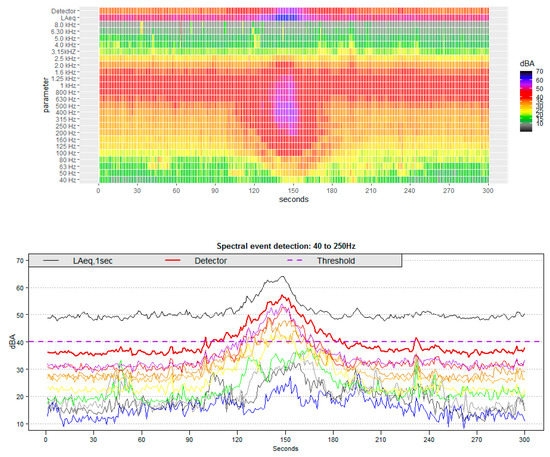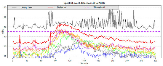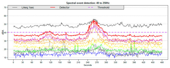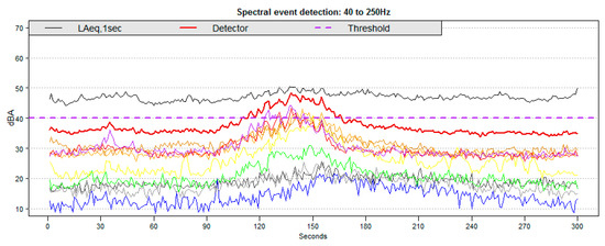 Time series of a standard event with LAmax of 65 dBA that could/should be detected with ISO 20906:2009; the detector threshold is set to 52 dBA, showing LAeq,1sec, the detector and the detection threshold (40 dBA). The third-octave bands used in the detector are also shown (40–250 Hz). Higher-frequency bands are attributed significantly to the aircraft sound exposure level (SEL).