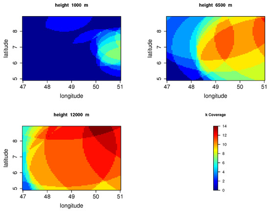 In this section, we illustrate the importance of an optimal deployment of WAM sensors by comparing the gain in the deployment quality metrics. Figure 1 shows the simulated k-coverage (an airspace location is said to be k-covered if an ADS-B-Out signal sourced from that location is received by exactly k ground sensors) at three different altitudes (1000, 6500, and 12,000 m) for a real-world random placement of receivers in a bounded geographic area spanning between the latitudes 4.9 and 8.9 decimal degrees and the longitudes 47 and 51 decimal degrees. The fitness score of this placement obtained by the simulation is 0.355, and the GDOP distribution in the airspace volume considered is illustrated in Figure 2. This placement is clearly sub-optimal because of the over-densification of the receivers in certain areas. At 1000 m altitude, some 3D locations are eight-covered, whereas others are covered by less than four sensors.