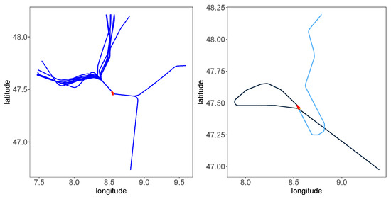 - Trajectories outside the circles of 45, 100, 150, 200, and 250 nautical miles around Zurich Airport are excluded (entry points of these five circles are shown in the right subplot of Figure 1).