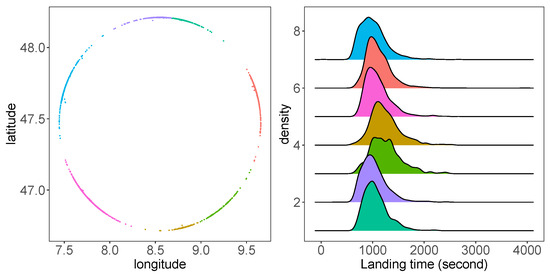 To use the direction at the entry point of the circle as a predictor, we clustered the observations using a K-means clustering algorithm. Figure 3 presents an example of entry points at a circle with a 45 NM radius. These entry points can be clustered with the K-means method into seven groups, representing trajectories from seven directions [5]. In the right of Figure 3, the density plot of the landing time of these groups reveals the differences of these trajectories from seven directions.