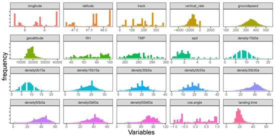 Figure 4 exhibits the traffic density depending on the time with each density layer about the traffic frequency of a day and the height of this plot denoting the number of aircraft entering the circle. The traffic density shown in Figure 4 significantly depends on the time of the day. To extract features regarding the traffic capacity, a time interval, 15 min after this aircraft entering the circle, is considered before or after an aircraft enters the circle. This time interval is then extended to 30 and 60 min before or after an aircraft entering the circle to consider traffic density in the short and long time period. A more precise count of traffic density will not only consider aircraft entering as in Figure 4 but also exclude aircraft landing or departing out of the circle within this time interval. In other words, the number of aircraft in the air and within the circle are counted within a given time interval as features, which is how the features of traffic density in Table 1 are extracted.