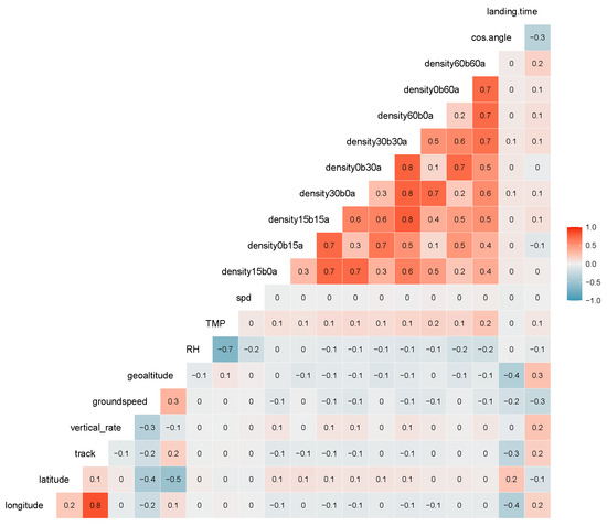 The histogram of numerical features extracted in Table 1 is shown in Figure 5. The landing time can exceed 40 min, as can be seen in the right bottom subplot of Figure 5. Those extreme data are removed in [5,11] to make observations more homogeneous, but not in our work. Features like longitude, latitude, track, relative humidity, temperature, wind speed, and the cosine of the angle between tracks entering and landing do not follow a normal distribution (see Figure 5). Among air traffic density variables, such as time interval increases, the number of aircraft also shifts to the right. In Figure 6, we present Spearman correlations of features and landing time for aircraft entering a circle with a radius of 45 NM. A linear correlation has a parametric assumption of an elliptical distribution, such as a normal distribution [12], which is not the case for most variables in Figure 5. Therefore, the rank correlation measure, Spearman’s Rho, is calculated in Figure 6 instead. Spearman’s Rho (1) is the linear correlation coefficients of the empirical margins, where empirical margin and is the rank of among .
