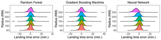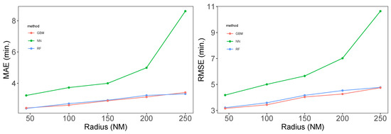 where n is the sample size, is the landing time interval, and is the estimated value in (2) and (3), respectively. Tree methods are better than neural networks. A random forest and a gradient boosting machine have both an MAE and RMSE smaller than 5 min for all radii (see Table 2).