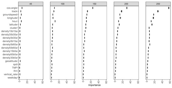 If is not an important predictor, the difference should not be comparatively large. The averaged MSE improvement of all trees is used to measure importance. The ranking of feature importance can be derived based on the improved MSE. As the radius increases from 45 NM to 250 NM, the landing time also increases; thus, the scale of MSE also increases. Because of this, the improved MSE can be compared with the same radius, but not for a different radius, in Figure 9. Feature importance results can be sensitive to the number of variables selected in each tree [17,18]. This parameter is set in Section 3.1 to minimize the cost function on the validation set. Random seeds are set as 20 different values for a variation in the boxplot in Figure 9. It shows a variation in importance ranking with different radius, but in general, the cosine of the angle between tracks entering and landing, ground speed, the track angle, longitude, and traffic density are relatively important. Weather variables, such as temperature and relative humidity, are not measured as important since that weather information near the closest observation of GFS analysis data is used.