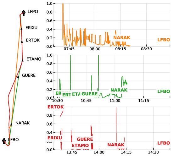Different trajectories from Paris–Orly LFPO to Toulouse LFBO range from a direct to NARAK(entry point to the TMA) to a route following all the points of the flight plan. A long interval without a flight plan navigational point in heading may suggest an instruction from the ATC.