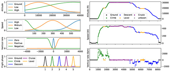 Example of flight phase identification using fuzzy logic, with fuzzy logic member functions (left) and the vertical profile with identified flight phases (right).