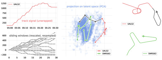 The 19,480 trajectories are split into sliding windows, rescaled and resampled (30 samples per window). The resulting 72,353 samples are then projected with a PCA. Holding patterns cluster in the latent space: the red part of the trajectory is well identified as a holding pattern, whereas the green trajectory, in spite of a pattern easily mistaken with rule-based models, stays in the regular cluster.
