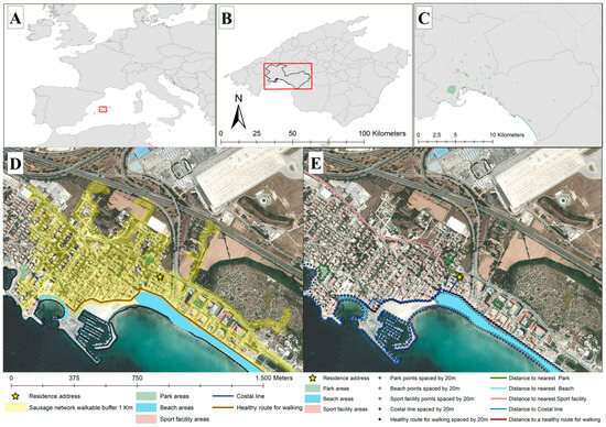 Study area of Palma, Mallorca (A–C). Example of neighborhood exposure to public open spaces (POS) with a 1 km sausage network walkable street buffer around of the residence address represented by the yellow area (D) and the point boundaries of the Built Environments (E).