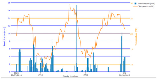 Mean daily precipitation (mm) and mean temperature (°C) during the study from closest participants’ resident weather station.