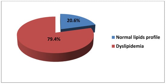 After 12 hours of fasting, a venous blood sample (5 mL) was taken. Quantitative determination of the lipid profile of participants including total cholesterol (TC), triglycerides (TG), high-density lipoprotein (HDL) cholesterol, and low-density lipoprotein (LDL) cholesterol, after centrifugation of the blood separation of serum, was done []. Dyslipidemia was operationally defined by one or more of the following abnormalities: Total cholesterol > 200 mg/dL, triglycerides > 150 mg/dL, LDL-C > 130 mg/dL, HDL-C < 40 mg/dL in men; hypercholesterolemia: Total cholesterol > 200 mg/dL; hypertriglyceridemia: triglycerides > 150 mg/dL; hypoHDLaemia: HDL-C < 40 mg/dL; hyperLDLaemia: LDL-C > 130 mg/dL [].
