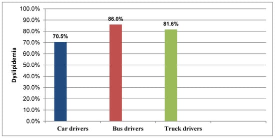 Professional drivers are exposed to several occupational risk factors such as long working hours, shift work, noise, carbon monoxide, and chemical materials. These factors increase the probability of emerging CVDs. Moreover, these drivers are more prone to developing obesity as they burn fewer calories due to the nature of the work activities, eating poor and irregular diets and driving in a sitting position for long durations every day []. Dyslipidemia is a well-established modifiable cardiovascular risk factor []. It is a heterogeneous disorder which may occur due to multiple etiologies. Most dyslipidemia is secondary to dietary habits and lifestyle []. The risk factors of dyslipidemia include age, smoking, genetics, diet, physical activity, and stress []. Although cross-sectional studies have linked occupational stress with lipid disorders, this association is still not consistent [].