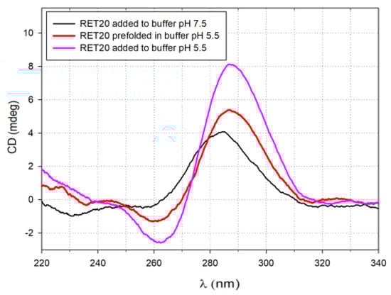 Circular dichroism (CD) spectra of samples were recorded on a Jasco J-820 spectropolarimeter (Jasco, Tokyo, Japan) with a connected temperature controller (PTC-423L). The CD spectra were obtained by taking the average of three scans in the range of 400–200 nm, with a scan rate of 500 nm/min.