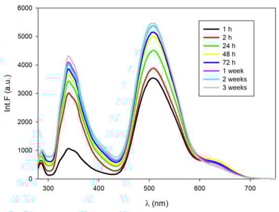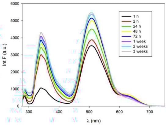 Knowing that the Ag+/DNA molar ratio determines the fluorescence intensity [22,29,30,31], we tested the three different Ag+/DNA molar ratios for preparation of the RET20-AgNCs nanoclusters. The RET20-AgNCs were prepared at 1:1, 0.5:1, 2:1 molar ratios of Ag+/cytosine (C) bases. As expected, the Ag+/C molar ratio influenced RET20-AgNCs fluorescence intensity as well as the proportion between “red” and “green” emission (compare black lines in Figure 1b–d). Moreover, the emission spectra of RET20-AgNCs with excitation at 550 nm revealed that nanoclusters prepared at a 1:1 Ag+/C molar ratio showed the highest fluorescence intensity values after 24 since reduction comparing with the ones prepared at 0.5:1 or 2:1 molar ratio (Ag+/C).