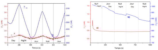 (Left) gate current IG (curve a) and drain current ID (curve b) of an electrolyte-gated organic field-effect transistor (EGOFET) containing 106 cyanobacteria per mL of electrolyte, under illumination cycles of 200 s each. Gate diameter = 110 μm. VGS = −0.8 V; VDS = −0.6 V. (Right) gate and drain current under the same conditions, without cyanobacteria. Only the photocurrent appears on ID.