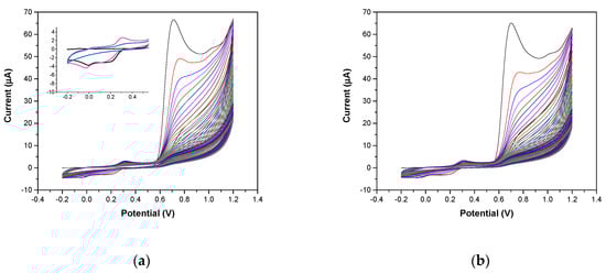 During the CV, the first peak at +0.70 V indicated the formation of cation radicals that promoted the polymerization process, once to the oxidation of 4-APA. Further peaks at +0.19 V and at −0.025 V are related to the reduction of the polymer film on the SPCE surface. Following the second potential cycle, two oxidation waves appeared at the potentials of +0.040 and + 0.305 V, corresponding to the oxidation of the formed polymeric film. After around 17 cycles of polymerization, a decrease in the anodic peaks current was notable, indicating the subsequent formation of the polymer film (see Inset of Figure 1a). Finally, the formation of the film produced a partial blockage of the electrode surface. The electropolymerization of NIP (Figure 1b) followed the same interpretation of the process, with differences in terms of current appeared along the second cycle of CV.